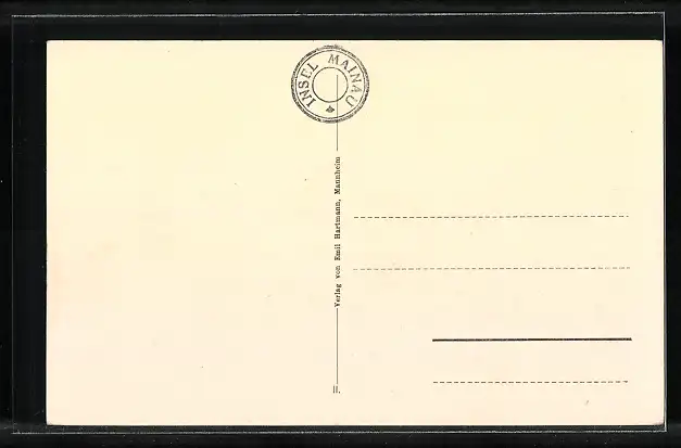 Personenbezogene Daten auf der Rückseite der Karte wurden durch blauen Textmarker unkenntlich gemacht. Die blauen Stellen sind auf die Vorderseite durchgeweicht und wirken sich negativ auf das Postkartenfoto aus