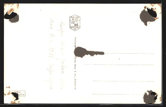 Personenbezogene Daten auf der Rückseite der Karte wurden durch blauen Textmarker unkenntlich gemacht. Die blauen Stellen sind auf die Vorderseite durchgeweicht und wirken sich negativ auf das Postkartenfoto aus