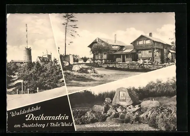 AK Inselsberg /Thür. Wald, Waldschänke Dreiherrnstein, Viktor-v.-Scheffel-Denkmal