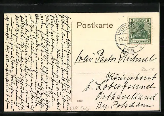 Personenbezogene Daten auf der Rückseite der Karte wurden durch blauen Textmarker unkenntlich gemacht. Die blauen Stellen sind auf die Vorderseite durchgeweicht und wirken sich negativ auf das Postkartenfoto aus