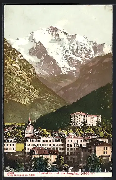 AK Interlaken, Blick über einen Teil der Ortschaft zur Jungfrau