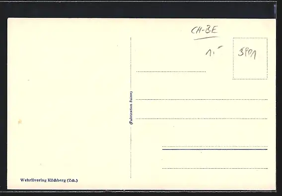 Personenbezogene Daten auf der Rückseite der Karte wurden durch blauen Textmarker unkenntlich gemacht. Die blauen Stellen sind auf die Vorderseite durchgeweicht und wirken sich negativ auf das Postkartenfoto aus