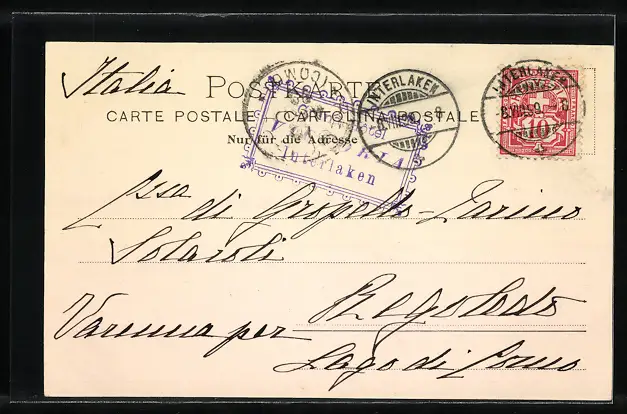 Personenbezogene Daten auf der Rückseite der Karte wurden durch blauen Textmarker unkenntlich gemacht. Die blauen Stellen sind auf die Vorderseite durchgeweicht und wirken sich negativ auf das Postkartenfoto aus