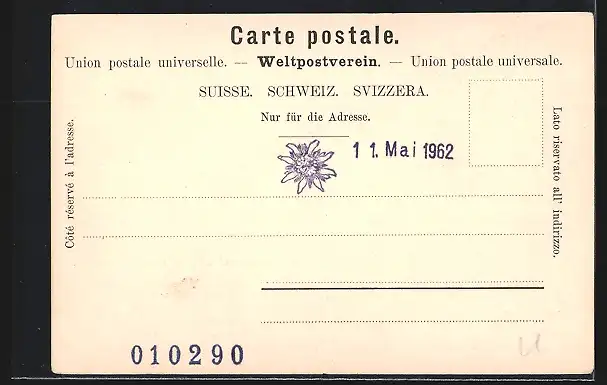 Personenbezogene Daten auf der Rückseite der Karte wurden durch blauen Textmarker unkenntlich gemacht. Die blauen Stellen sind auf die Vorderseite durchgeweicht und wirken sich negativ auf das Postkartenfoto aus