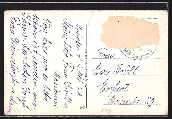 Personenbezogene Daten auf der Rückseite der Karte wurden durch blauen Textmarker unkenntlich gemacht. Die blauen Stellen sind auf die Vorderseite durchgeweicht und wirken sich negativ auf das Postkartenfoto aus