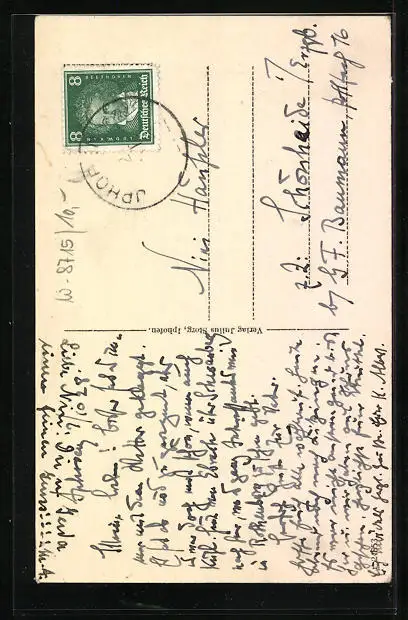 Personenbezogene Daten auf der Rückseite der Karte wurden durch blauen Textmarker unkenntlich gemacht. Die blauen Stellen sind auf die Vorderseite durchgeweicht und wirken sich negativ auf das Postkartenfoto aus