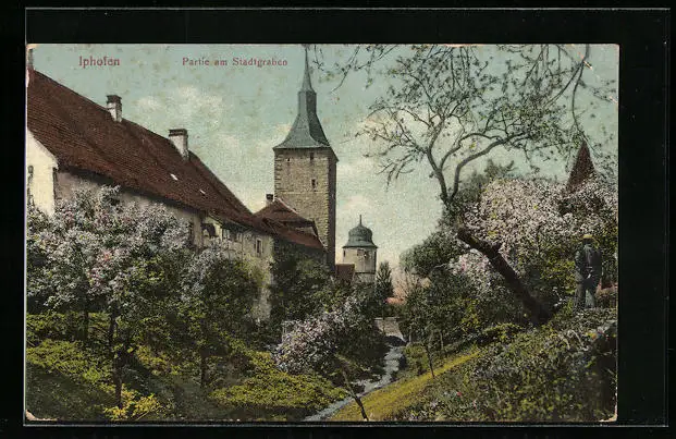 AK Iphofen, Partie am Stadtgraben mit Kirche