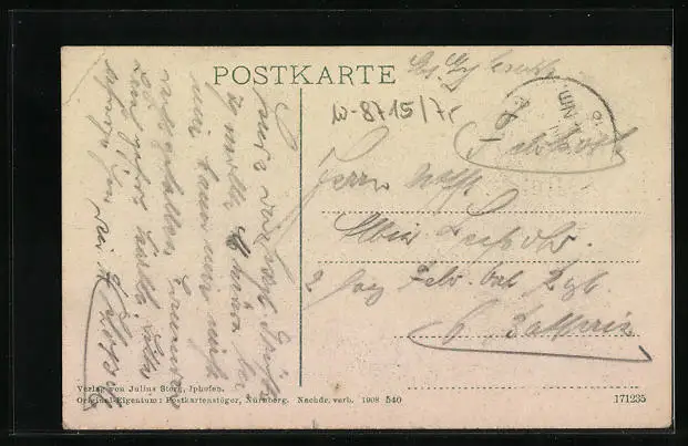 Personenbezogene Daten auf der Rückseite der Karte wurden durch blauen Textmarker unkenntlich gemacht. Die blauen Stellen sind auf die Vorderseite durchgeweicht und wirken sich negativ auf das Postkartenfoto aus