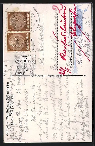 Personenbezogene Daten auf der Rückseite der Karte wurden durch blauen Textmarker unkenntlich gemacht. Die blauen Stellen sind auf die Vorderseite durchgeweicht und wirken sich negativ auf das Postkartenfoto aus