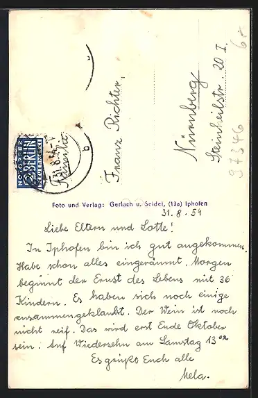 alte Ansichtskarte, gelaufen 1954, Briefmarke entfernt, rückseitig Oberflächenschaden, guter Zustand
