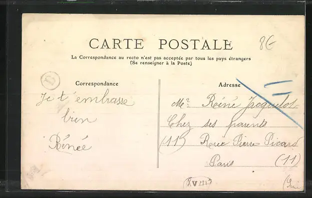 Personenbezogene Daten auf der Rückseite der Karte wurden durch blauen Textmarker unkenntlich gemacht. Die blauen Stellen sind auf die Vorderseite durchgeweicht und wirken sich negativ auf das Postkartenfoto aus
