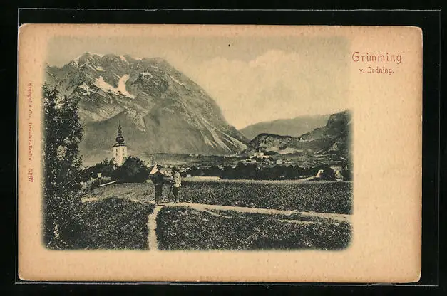 AK Irdung, Ortsansicht mit zwei Wanderern und den Bergen
