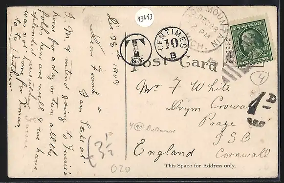 Personenbezogene Daten auf der Rückseite der Karte wurden durch blauen Textmarker unkenntlich gemacht. Die blauen Stellen sind auf die Vorderseite durchgeweicht und wirken sich negativ auf das Postkartenfoto aus
