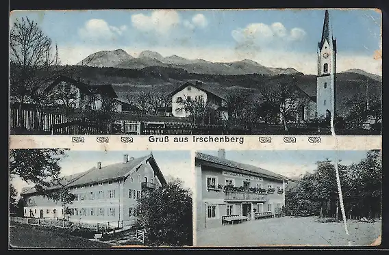 AK Irschenberg, Gasthaus, Teilansicht mit Kirche und Bergpanorama