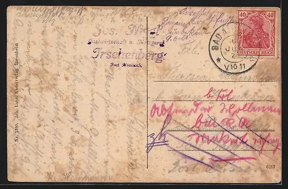 Personenbezogene Daten auf der Rückseite der Karte wurden durch blauen Textmarker unkenntlich gemacht. Die blauen Stellen sind auf die Vorderseite durchgeweicht und wirken sich negativ auf das Postkartenfoto aus