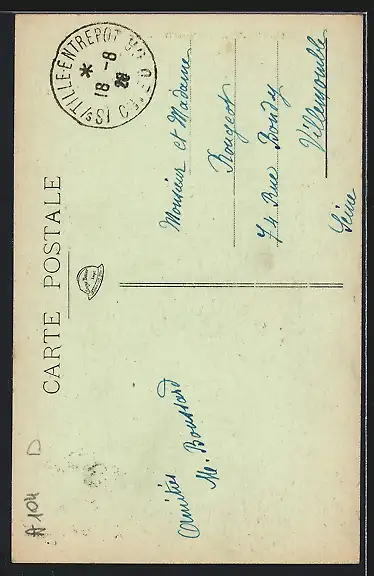 Personenbezogene Daten auf der Rückseite der Karte wurden durch blauen Textmarker unkenntlich gemacht. Die blauen Stellen sind auf die Vorderseite durchgeweicht und wirken sich negativ auf das Postkartenfoto aus