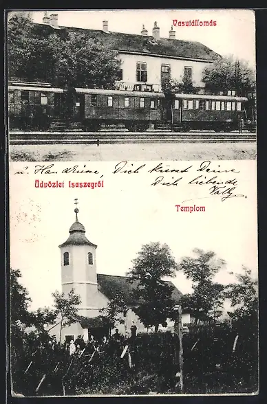 AK Isaszeg, Vasutallomas, Templom, Bahnhof