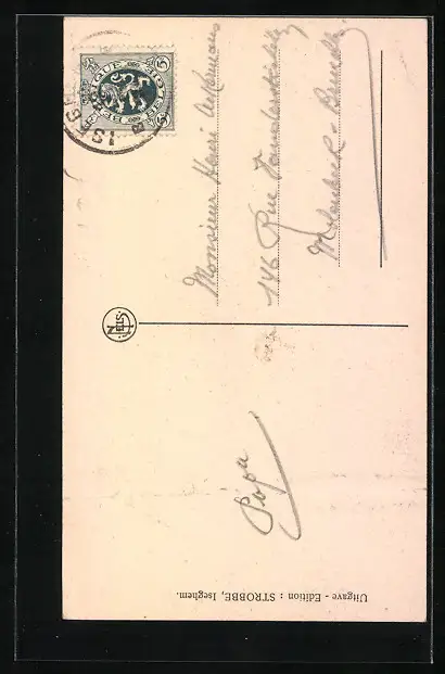 Personenbezogene Daten auf der Rückseite der Karte wurden durch blauen Textmarker unkenntlich gemacht. Die blauen Stellen sind auf die Vorderseite durchgeweicht und wirken sich negativ auf das Postkartenfoto aus