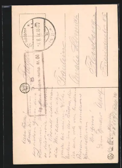 Personenbezogene Daten auf der Rückseite der Karte wurden durch blauen Textmarker unkenntlich gemacht. Die blauen Stellen sind auf die Vorderseite durchgeweicht und wirken sich negativ auf das Postkartenfoto aus