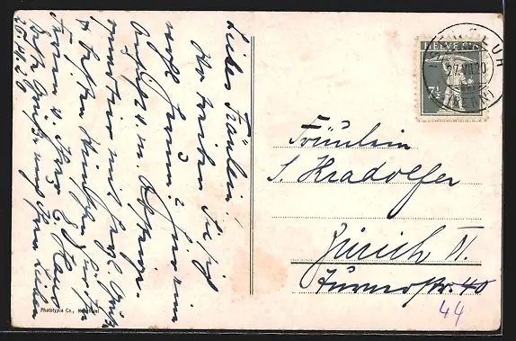 Personenbezogene Daten auf der Rückseite der Karte wurden durch blauen Textmarker unkenntlich gemacht. Die blauen Stellen sind auf die Vorderseite durchgeweicht und wirken sich negativ auf das Postkartenfoto aus