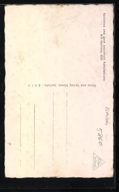 Personenbezogene Daten auf der Rückseite der Karte wurden durch blauen Textmarker unkenntlich gemacht. Die blauen Stellen sind auf die Vorderseite durchgeweicht und wirken sich negativ auf das Postkartenfoto aus