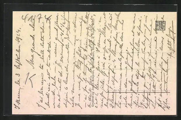 Personenbezogene Daten auf der Rückseite der Karte wurden durch blauen Textmarker unkenntlich gemacht. Die blauen Stellen sind auf die Vorderseite durchgeweicht und wirken sich negativ auf das Postkartenfoto aus