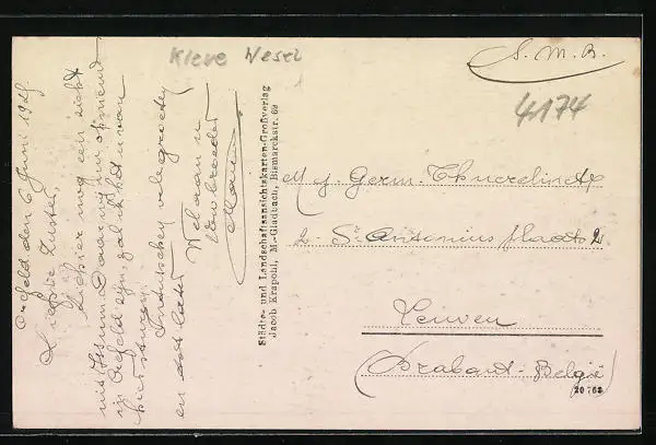 Personenbezogene Daten auf der Rückseite der Karte wurden durch blauen Textmarker unkenntlich gemacht. Die blauen Stellen sind auf die Vorderseite durchgeweicht und wirken sich negativ auf das Postkartenfoto aus
