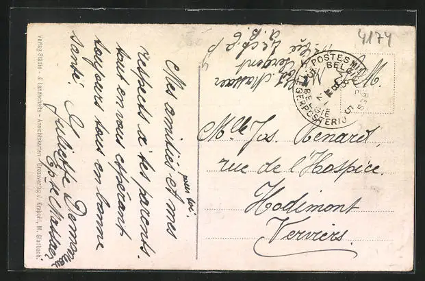 Personenbezogene Daten auf der Rückseite der Karte wurden durch blauen Textmarker unkenntlich gemacht. Die blauen Stellen sind auf die Vorderseite durchgeweicht und wirken sich negativ auf das Postkartenfoto aus