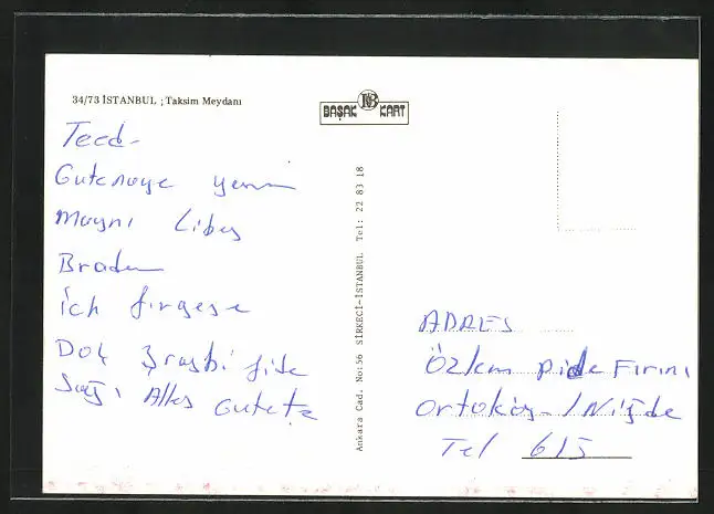 Personenbezogene Daten auf der Rückseite der Karte wurden durch blauen Textmarker unkenntlich gemacht. Die blauen Stellen sind auf die Vorderseite durchgeweicht und wirken sich negativ auf das Postkartenfoto aus