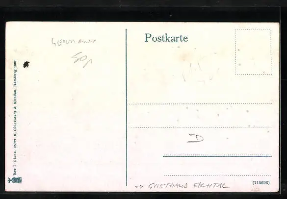 Personenbezogene Daten auf der Rückseite der Karte wurden durch blauen Textmarker unkenntlich gemacht. Die blauen Stellen sind auf die Vorderseite durchgeweicht und wirken sich negativ auf das Postkartenfoto aus
