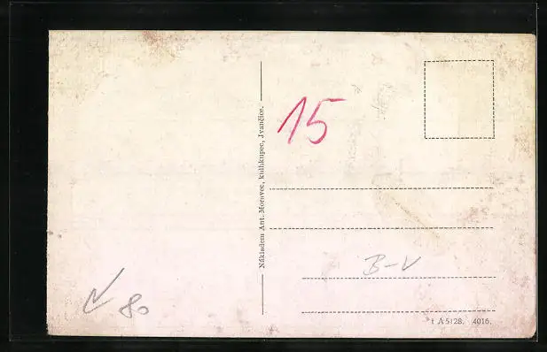 Personenbezogene Daten auf der Rückseite der Karte wurden durch blauen Textmarker unkenntlich gemacht. Die blauen Stellen sind auf die Vorderseite durchgeweicht und wirken sich negativ auf das Postkartenfoto aus