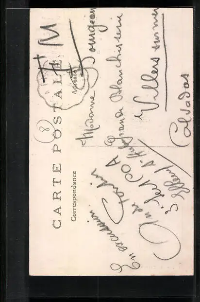 Personenbezogene Daten auf der Rückseite der Karte wurden durch blauen Textmarker unkenntlich gemacht. Die blauen Stellen sind auf die Vorderseite durchgeweicht und wirken sich negativ auf das Postkartenfoto aus