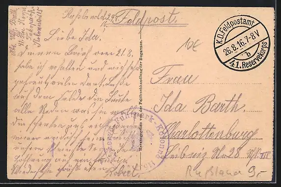 Personenbezogene Daten auf der Rückseite der Karte wurden durch blauen Textmarker unkenntlich gemacht. Die blauen Stellen sind auf die Vorderseite durchgeweicht und wirken sich negativ auf das Postkartenfoto aus
