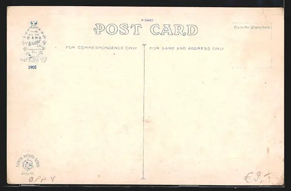 Personenbezogene Daten auf der Rückseite der Karte wurden durch blauen Textmarker unkenntlich gemacht. Die blauen Stellen sind auf die Vorderseite durchgeweicht und wirken sich negativ auf das Postkartenfoto aus