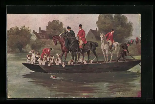 AK Jäger auf Pferden mit Hundemeute in einem Kahn