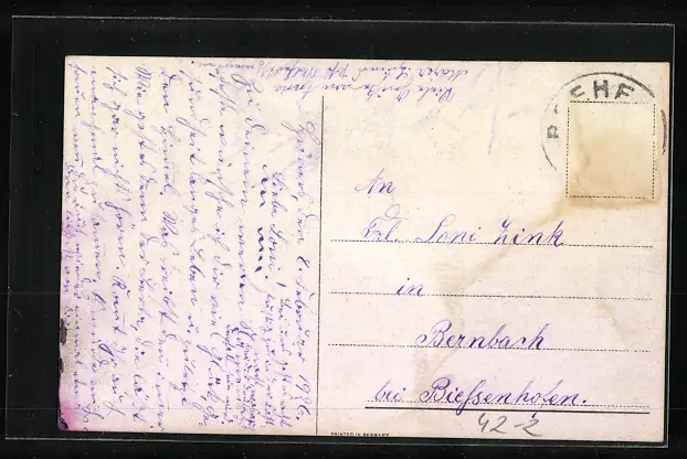Personenbezogene Daten auf der Rückseite der Karte wurden durch blauen Textmarker unkenntlich gemacht. Die blauen Stellen sind auf die Vorderseite durchgeweicht und wirken sich negativ auf das Postkartenfoto aus