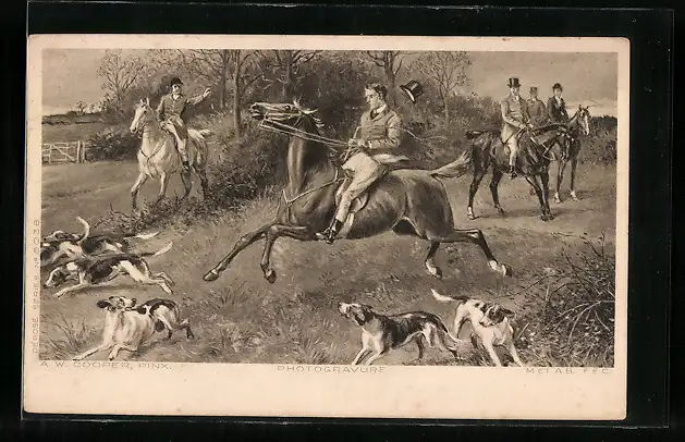 AK Jäger auf Pferden mit Hunden auf einer Wiese