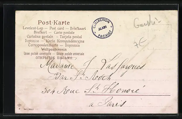 Personenbezogene Daten auf der Rückseite der Karte wurden durch blauen Textmarker unkenntlich gemacht. Die blauen Stellen sind auf die Vorderseite durchgeweicht und wirken sich negativ auf das Postkartenfoto aus