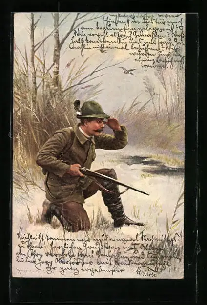 AK Jäger hält Ausschau in verschneiter Landschaft