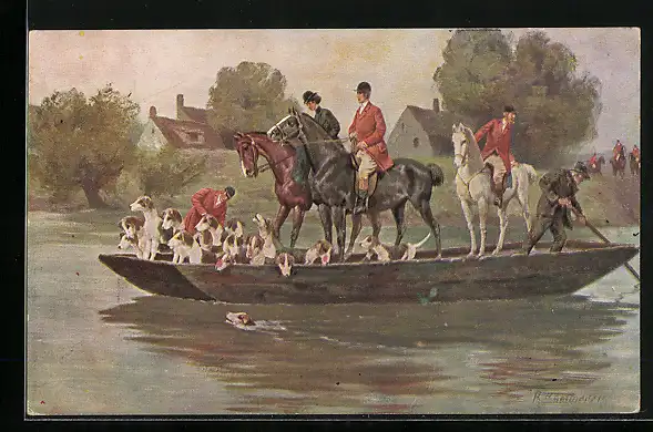 AK Jäger und Hunde lassen sich mit Pferden in einem Kahn fahren