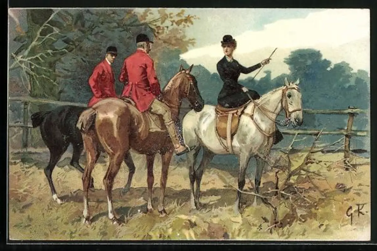 AK Jäger zu Pferd treffen auf einen Dame zu Pferd