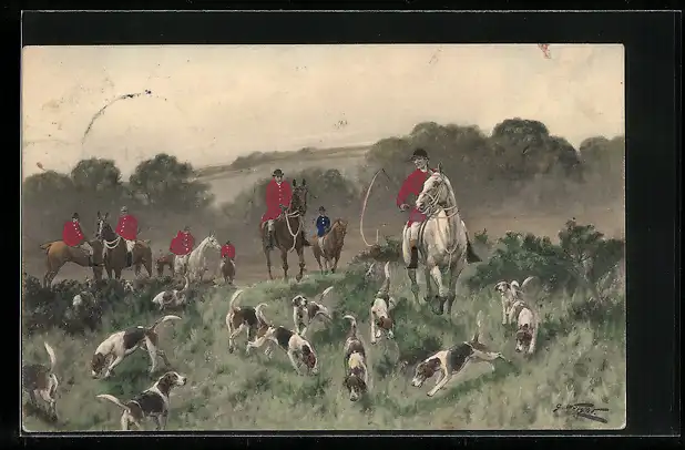 AK Jäger zu Pferde mit der Meute bei der Treibjagd