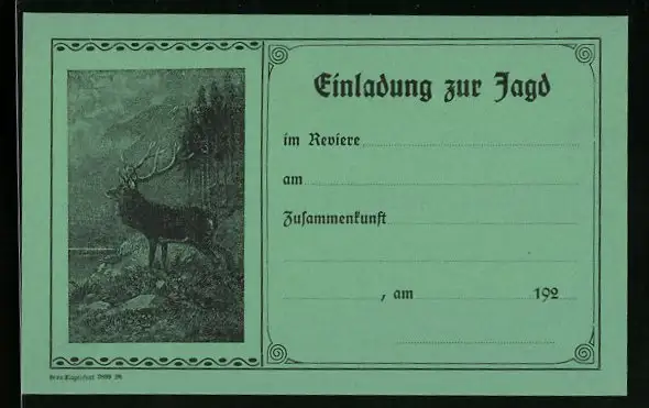 AK Jagdeinladung, Kapitaler Hirsch am Waldrand