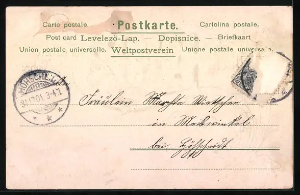alte Ansichtskarte, gelaufen, Briefmarke entfernt, rückseitig Oberflächenschaden, guter Zustand