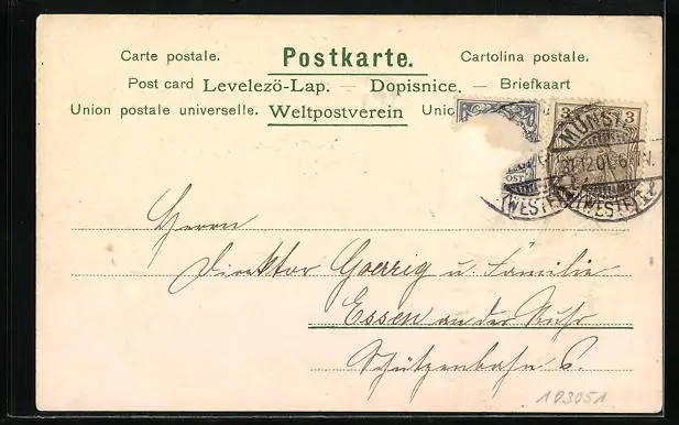 alte Ansichtskarte, gelaufen, Briefmarke entfernt, rückseitig Oberflächenschaden, Eckknick oben links, guter Zustand