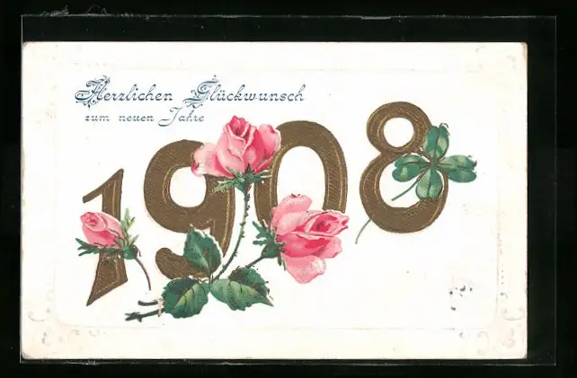 AK Jahreszahl 1908 mit Rosen und Kleeblatt