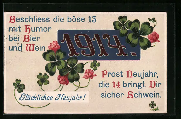 AK Jahreszahl 1914, Kleeblätter, Prosit Neujahr