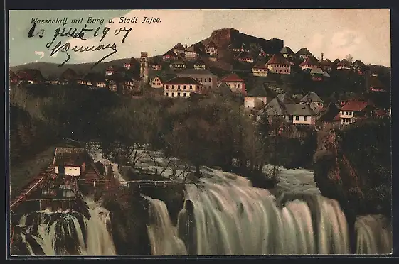 AK Jajce, Stadtansicht mit Wasserfall und Burg