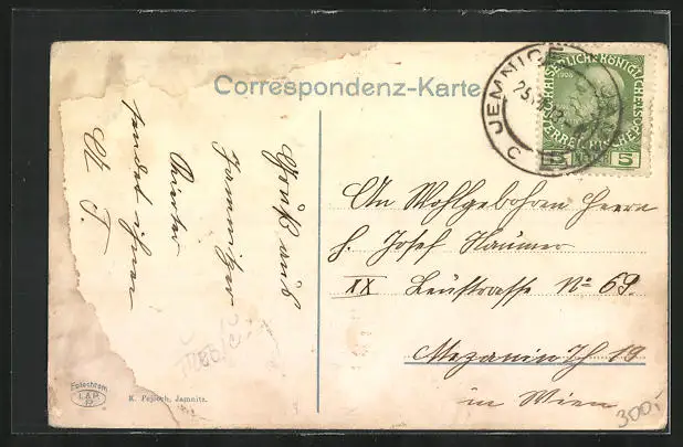 gelaufen 1913, leicht fleckig, Knick re. mittig, sonst guter Zustand