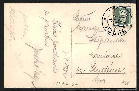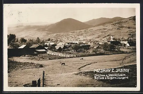 AK Jasina, Ortsansicht aus der Vogelschau mit Pferdeweide
